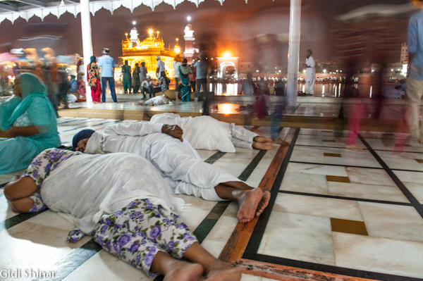 אחרי כמה דקות החלטתי למצוא מקום לישון. התיישבתי ליד עמוד פנוי ונשענתי עליו בעודי כותב את מאורעות היום ביומן. התפילות ברקע ממשיכות ברצף והאוויר התקרר מעט. אחד השומרים מגיע אלי במהרה ומנסה להסביר לי משהו בטון כועס, חשבתי שהוא מגרש אותי, במיוחד לאור העובדה שהייתי התייר המערבי היחידי באזור, אבל אחרי כמה שניות הבנתי שהרגליים שלי היו מכוונות לכיוון המקדש וזה אסור. סובבתי את עצמי 90 מעלות והכל היה בסדר. סביבי נמצאים משפחות, זקנים, זוגות צעירים, המקדש המוזהב מושך אליו את כל שכבות האכלוסיה, פה, כולם שווים. אני שוכב על הרצפה, רצועת התיק שלי מולבשת על היד והתיק מחובק קרוב, עד עכשיו לא גנבו לי כלום ואני מעדיף שזה ישאר ככה. לאורך כל הלילה המוני אנשים באים והולכים, התפילות ברמקולים לא מסתיימות ואני מתעורר כל שעתיים. לא השינה הכי טובה שהייתה לי אבל בהחלט הכי מיוחדת.
